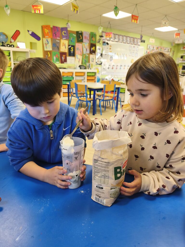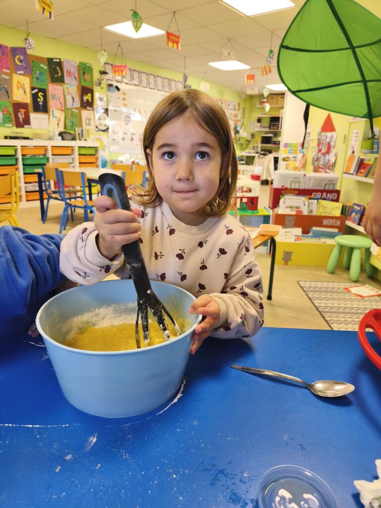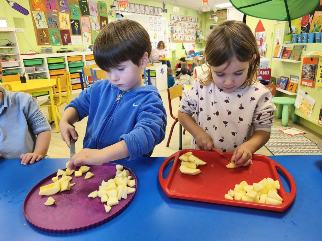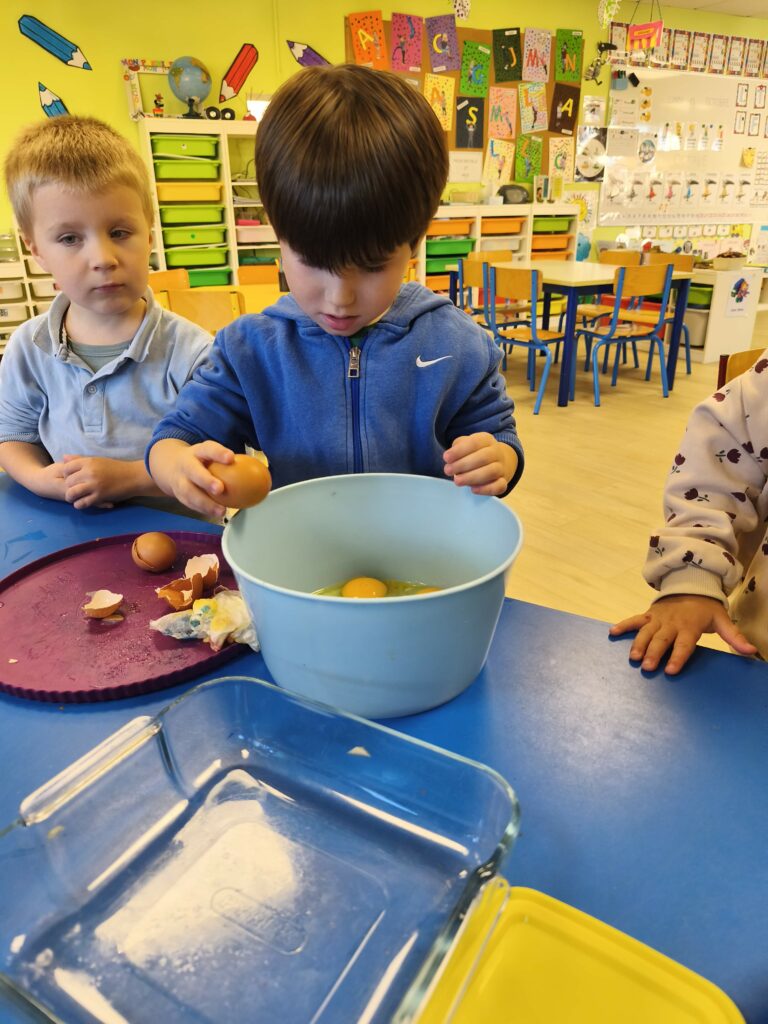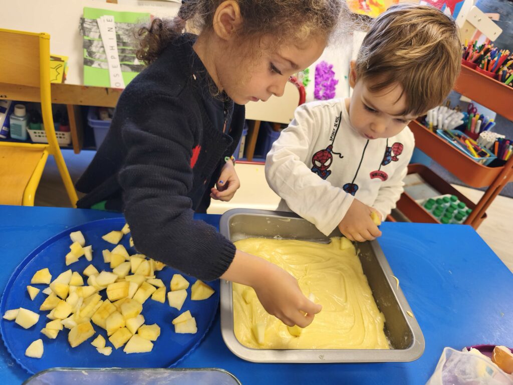 Pour fêter leurs anniversaires Sacha, Gabriel, Loïs, Stanislas et Jade ont réalisé un gâteau aux pommes avec Mélanie.