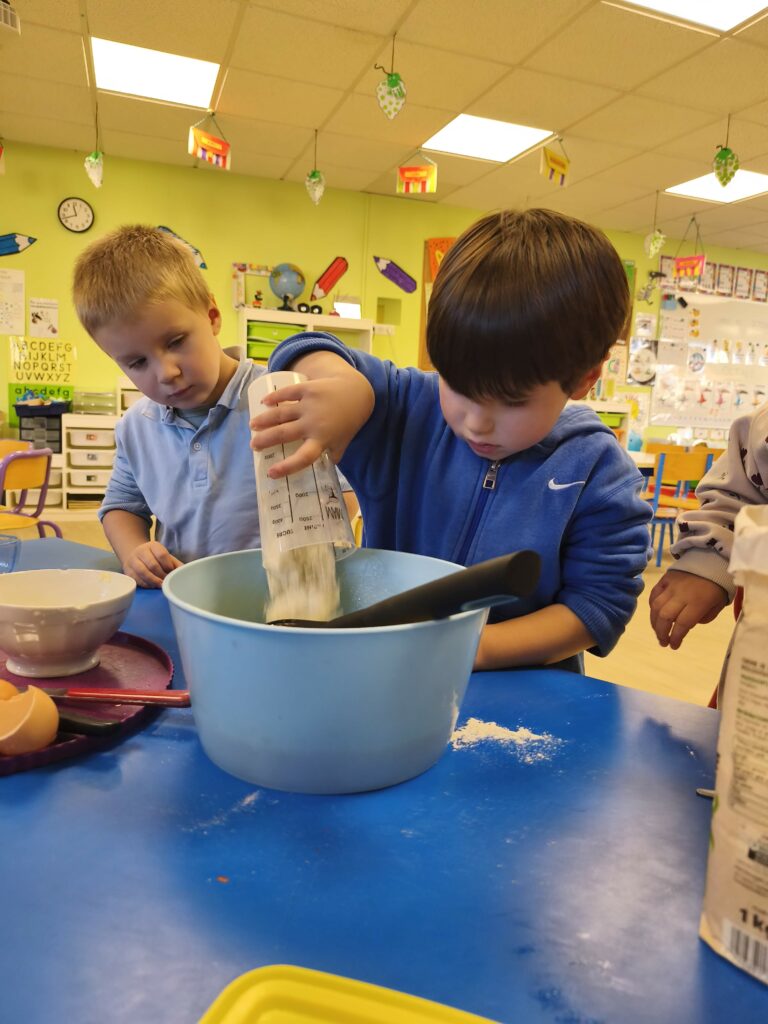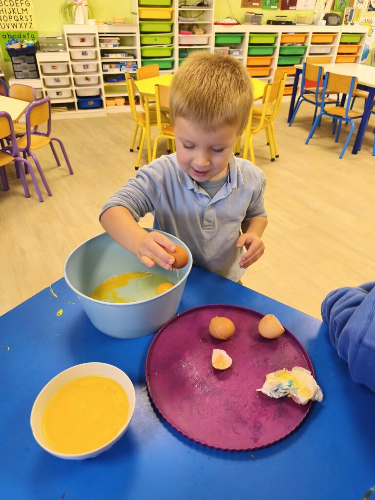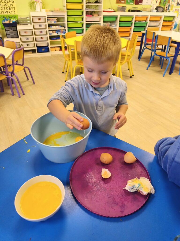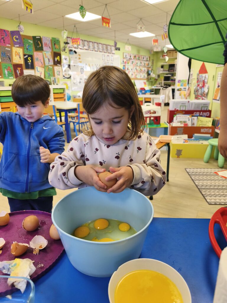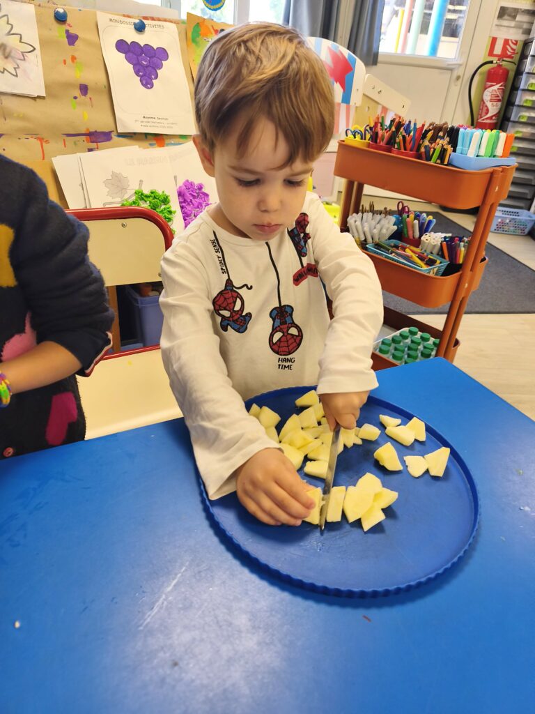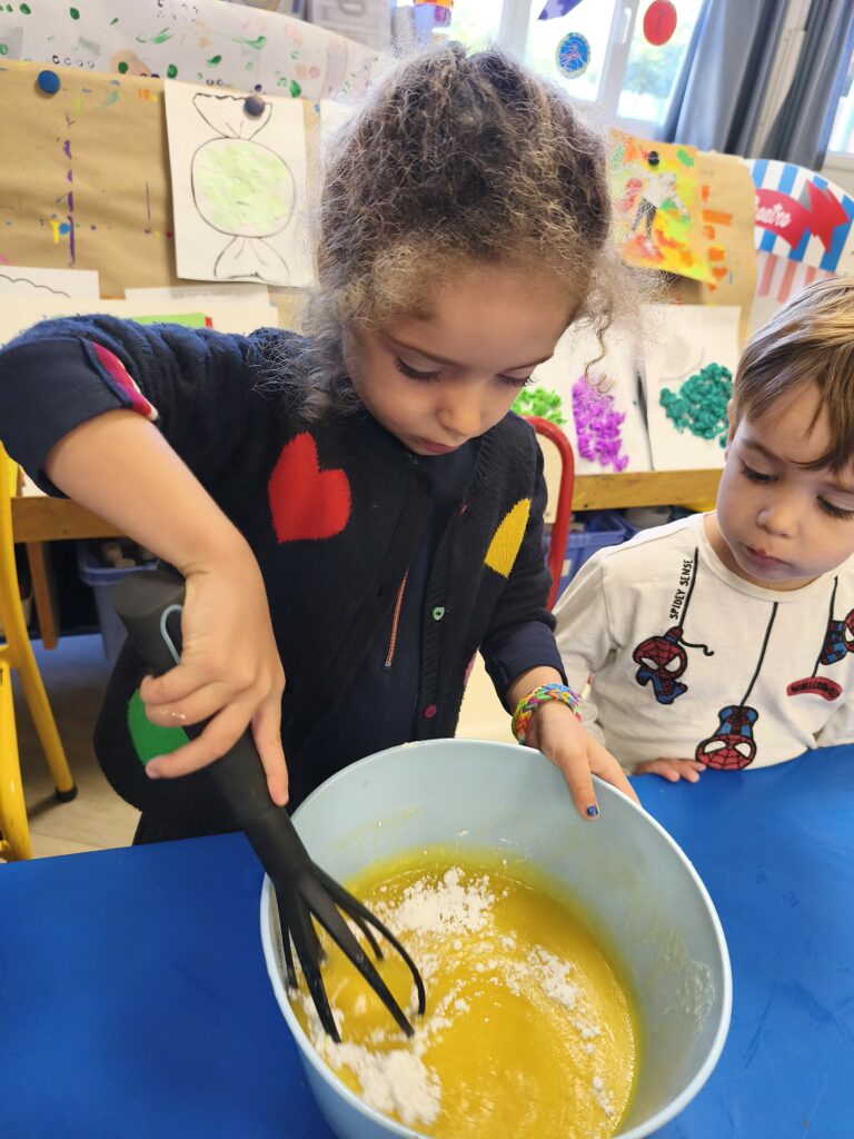 Pour fêter leurs anniversaires Sacha, Gabriel, Loïs, Stanislas et Jade ont réalisé un gâteau aux pommes avec Mélanie.