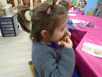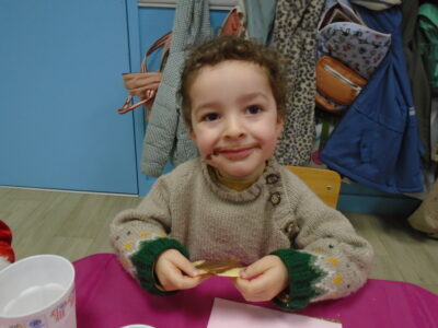 Nous avons partagé des pancakes avec de la confiture, du caramel, du chocolat, de la compote, du pain d’épices, de la brioche, des clémentines… et un chocolat chaud! Il y en avait pour tous les goûts.