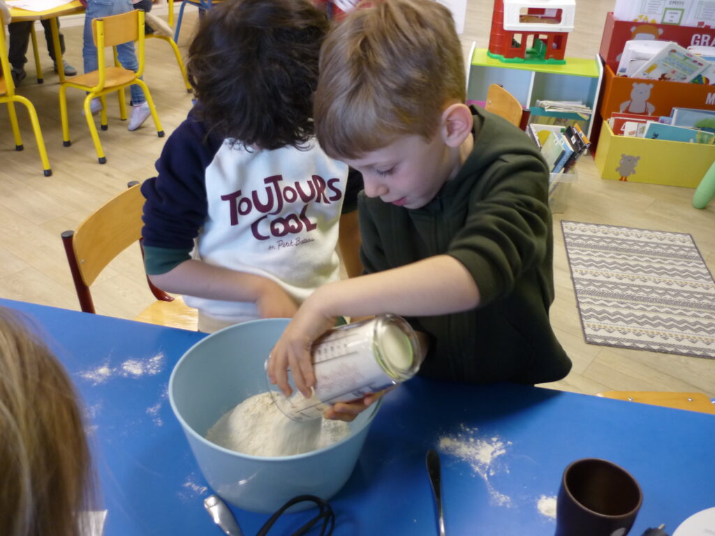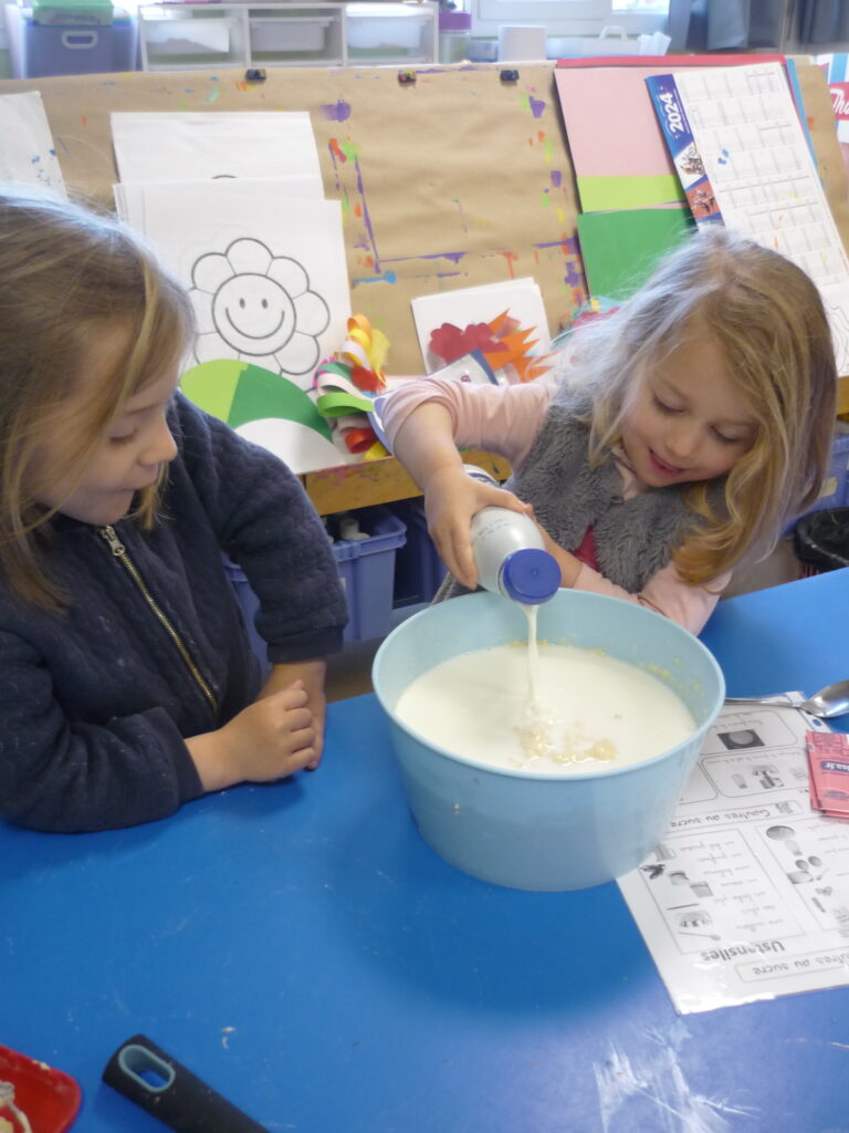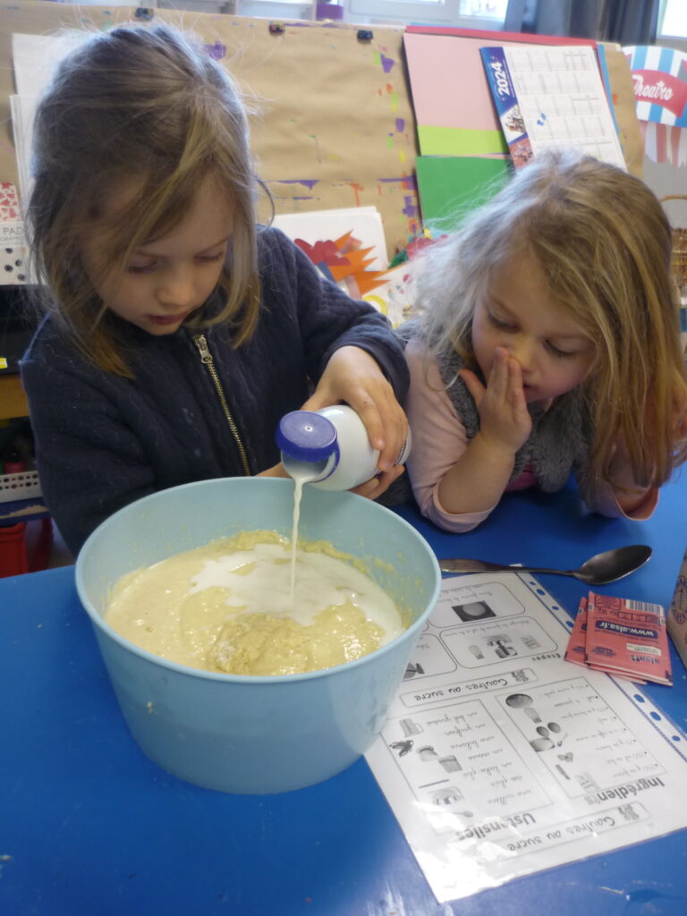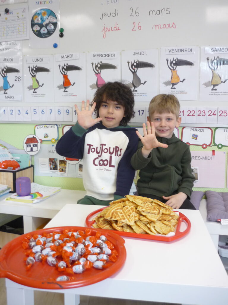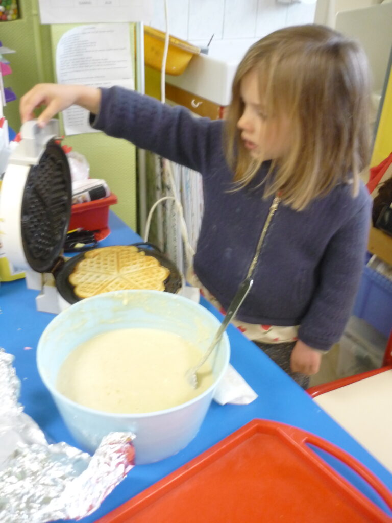 Pour fêter les anniversaires , Alice, Agathe, Joud et Léon ont préparé des gaufres avec l’aide de Mélanie.